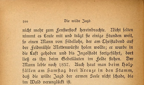so einen Mann von Sidellohe, der am Christabend auf der Feldmühle Mettenwürste holen wollte; er wurde in die Luft gehoben und bis Ingolstadt fortgeführt, dort ließ es ihn beim Gebetläuten im Felde stehen. Der Mann lebte noch 1857. Auch haut man beim Holzfällen am Samstag drei Kreuze in den Stamm, daß die wilde Jagd der armen Seele nicht schade, die im Wald verunglückt ist."