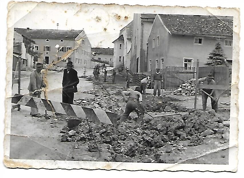 Straßenbau 1954, Nassenfels hatte eine mit Granitsteinen gepflasterte Ortsdurchfahrt, was damals etwas Besonderes war. Standpunkt des Fotografens in etwa auf Höhe des "Zehenstadel", Oben rechts ist das Gebäude des Bräus, darunter das haus d. "Bruderers". Oben links der "Braunbauer" und unten links der "Lippenbauer". Rückseite des Fotos: Heinz Graf, Nassenfels