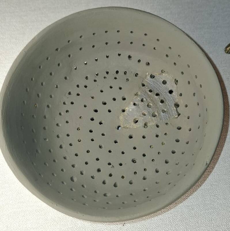 Zu den seltenen Einzelfunden aus dem Hochmittelalter, etwa aus dem 12. Jhdt. gehört das Bodenfragment eines Siebgefäßes. Derartige Gefäßformen hatten einen praktischen Nutzen, in dem man feste von flüssigen Stoffen trennen konnte. Vermutlich diente es zur Käseherstellung, in dem man die Molke so von der Käsemasse abtrennte. Durch die Löcher war es möglich, den Inhalt einfach wieder aus dem Gefäß zu entfernen. Auch andere Funktionen sind denkbar.