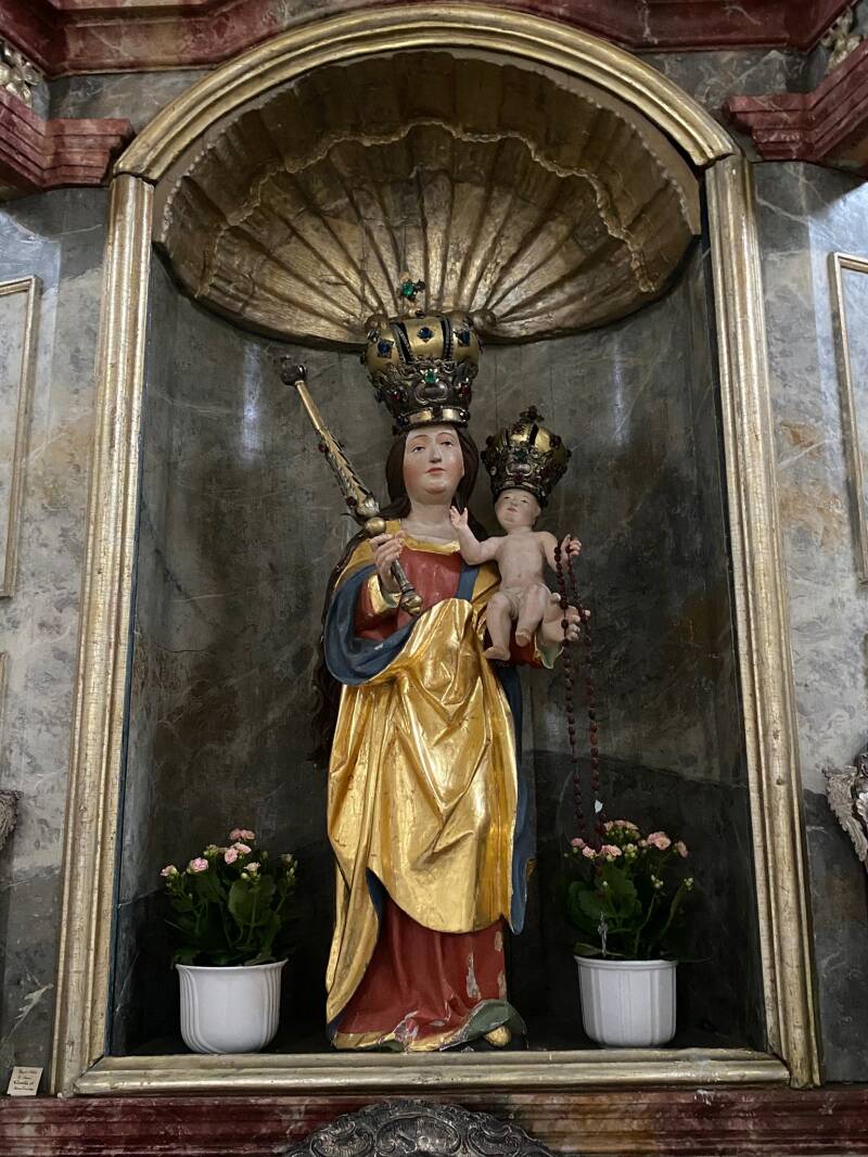Die um 1500 entstandene Holzfigur der Maria mit Kind schmückt den Hauptaltar der Nikolauskapelle.
